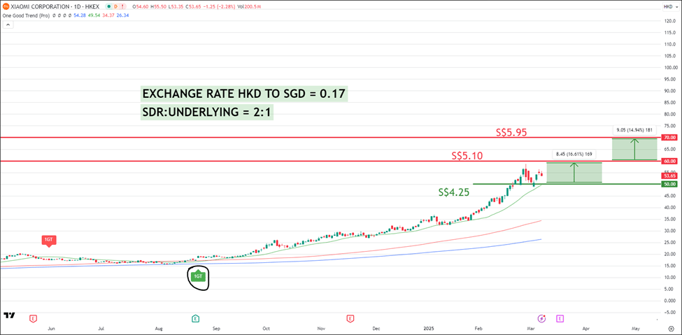 This presents an opportunity for conservative traders to accumulate on dips, with a stop-loss placed slightly below HKD 50 (S$4.25) to manage downside risk effectively.