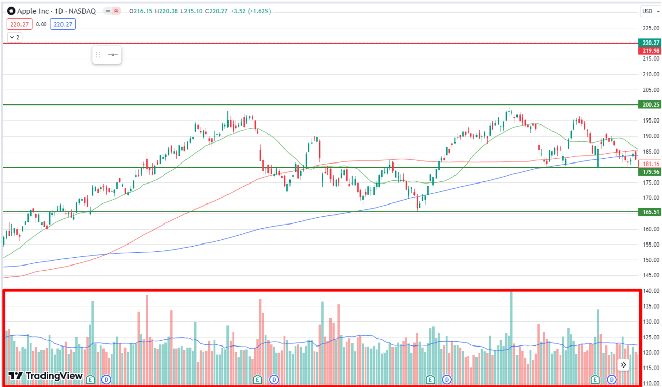 Volume measures how much of a financial instrument, like shares or contracts, is traded over a specific time. It’s shown in colored columns on charts: green for up volume and red for down volume, often with a moving average. Unlike most indicators, volume isn’t based on price.