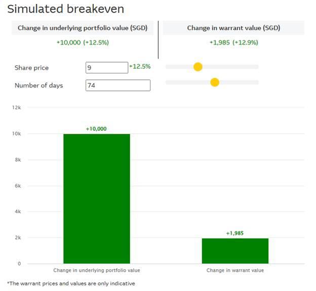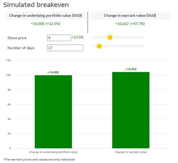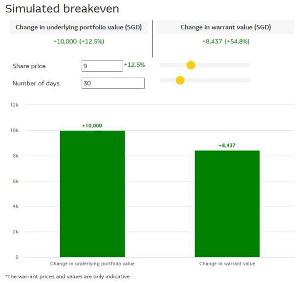 Macquarie has a tool known as the Simulator Exposure to help investors estimate their investment and returns with warrants versus the underlying share, as well as the maximum holding period if one were to purchase the warrant.