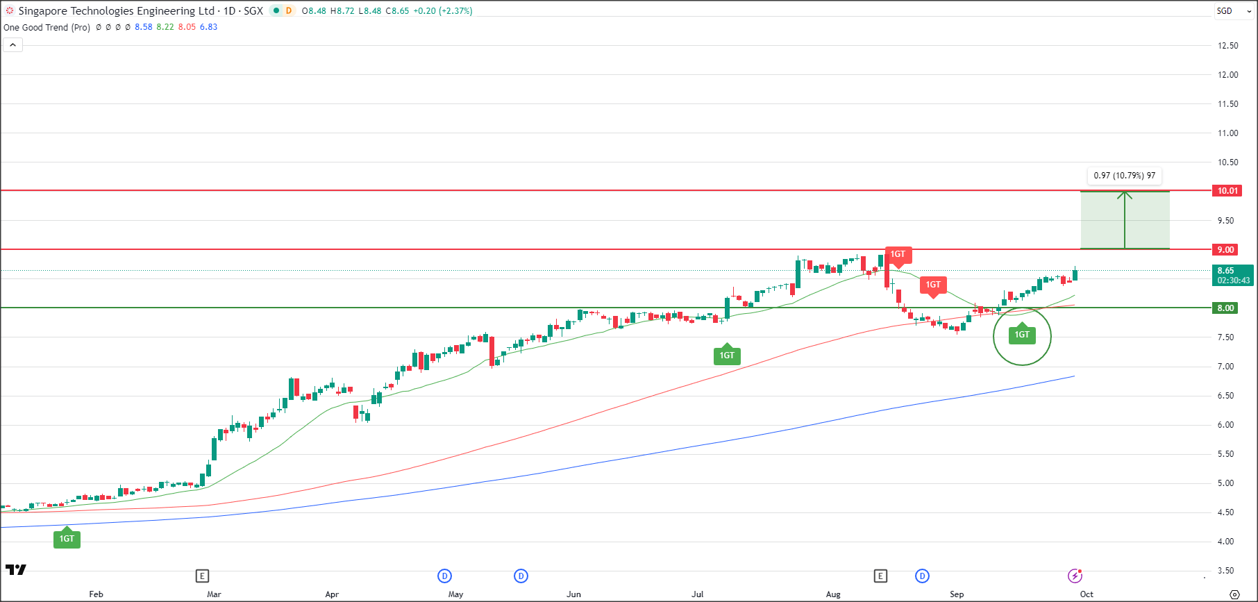 ST Engineering recently corrected from the $9.50 high, with the 1GT Bearish signal in August, flagging profit-taking. The stock pulled back toward the $8.00 support, even briefly dipping below it, which also coincided with the 100-day moving average.