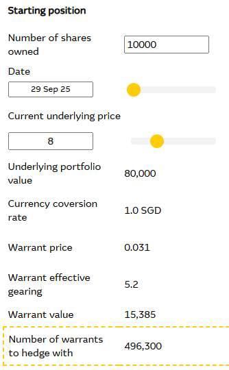 This is because, ST Engineering call warrant IIEW has an effective gearing level of 5.2 times (at the point of using the tool) and will move approximately 5.2 times more than ST Engineering shares, and costs only $0.031 versus ST Engineering’s $8.00 share price say, on 29 September (note that this date can be adjusted to whenever ST Engineering falls from its current price to $8.00)