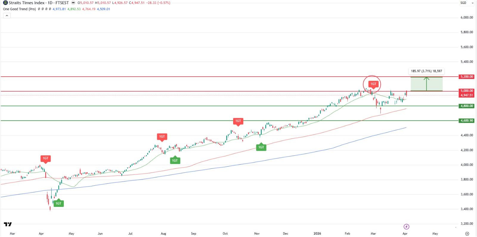 The range bound movement continues with the index trading between the 4,800 support and 5,000 psychological resistance where selling pressure had returned multiple times. A 1GT Bearish signals appeared in early March, which coincided with the start of the geopolitical war, indicating selling pressure has returned. However, the longer-term moving averages (100d and 200d MA) are still sloping up, signaling the long term uptrend is still intact at the moment.