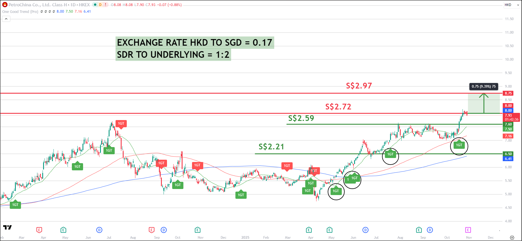 This stock is available via the PetroChina SDR listed on SGX, with the name “PetroCN HK SDR 1to2” (Ticker: HPCD), and an SDR-to-underlying ratio of 1 SDR to 2 shares. Based on the 0.17 HKD to SGD exchange rate, the SDR is currently priced around S$2.68.