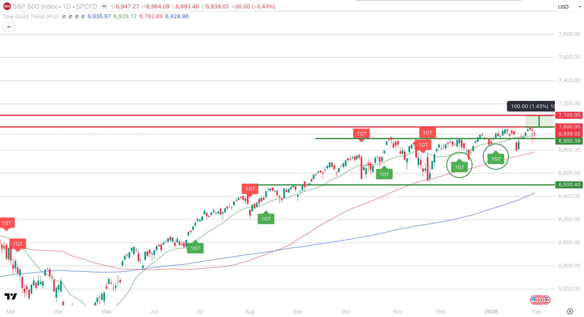With 2 1GT Bullish signals playing out for the index, it briefly testing the 7,000 resistance, it looks like the 6,900 level continues to hold firm with the higher target drawn to 7,100 if the buying momentum continues