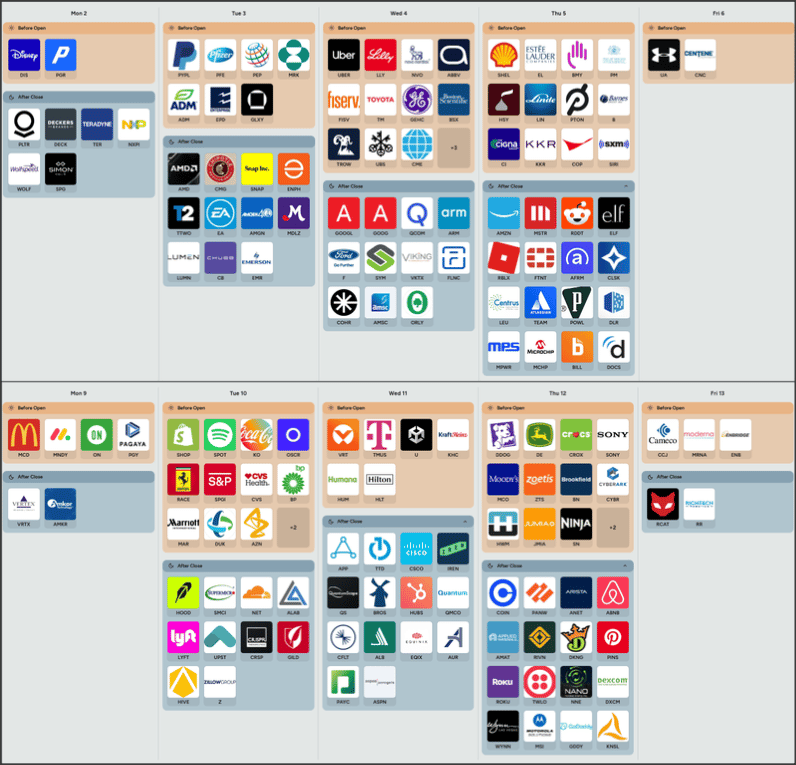 Note that the below information is taken from the dates found on Earnings Hub and Nasdaq. We've exclusively chosen stocks favored by investors with widely recognized names. The below calendar is not exhaustive and is indicative only. Please refer to Earnings Whispers & Nasdaq for the full list.