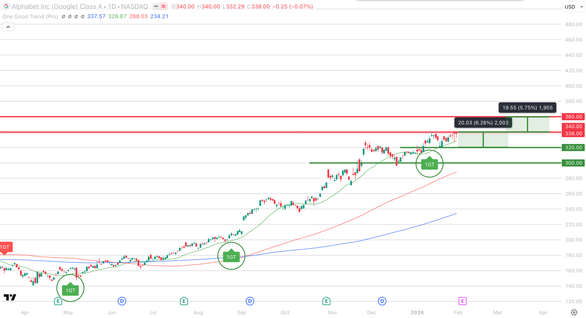 2 1GT Bullish signals have led to a breakout rally after prices pulled back to the 200.00 support previously and tested the 260 resistance twice.