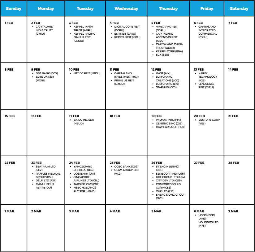 Note that the below information is taken from the dates displayed on TradingView and SG Investors IO. The below calendar is not exhaustive, it is indicative only. Please refer to SGX Announcement for exact dates & timings.