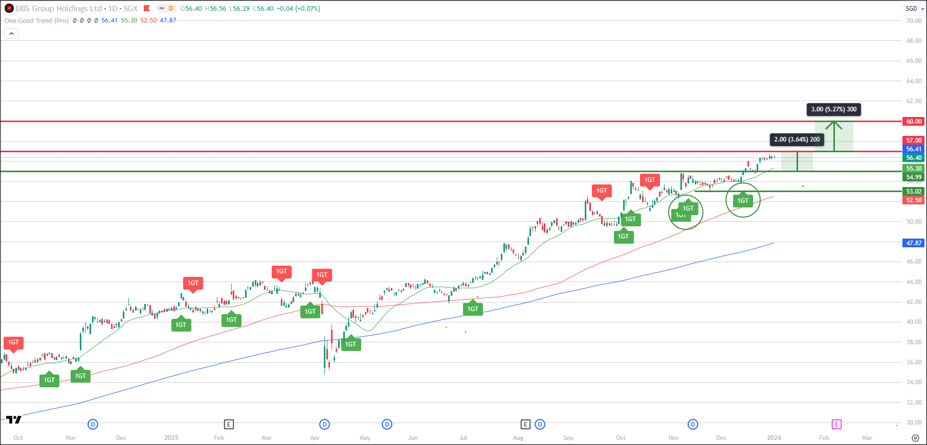 Multiple 1GT Bullish signals have appeared since November, while not exit signals have appeared, the trailing support is also currently close to the 55.00 level, placing a stop limit below this level could potentially protect profits and decrease downside risk