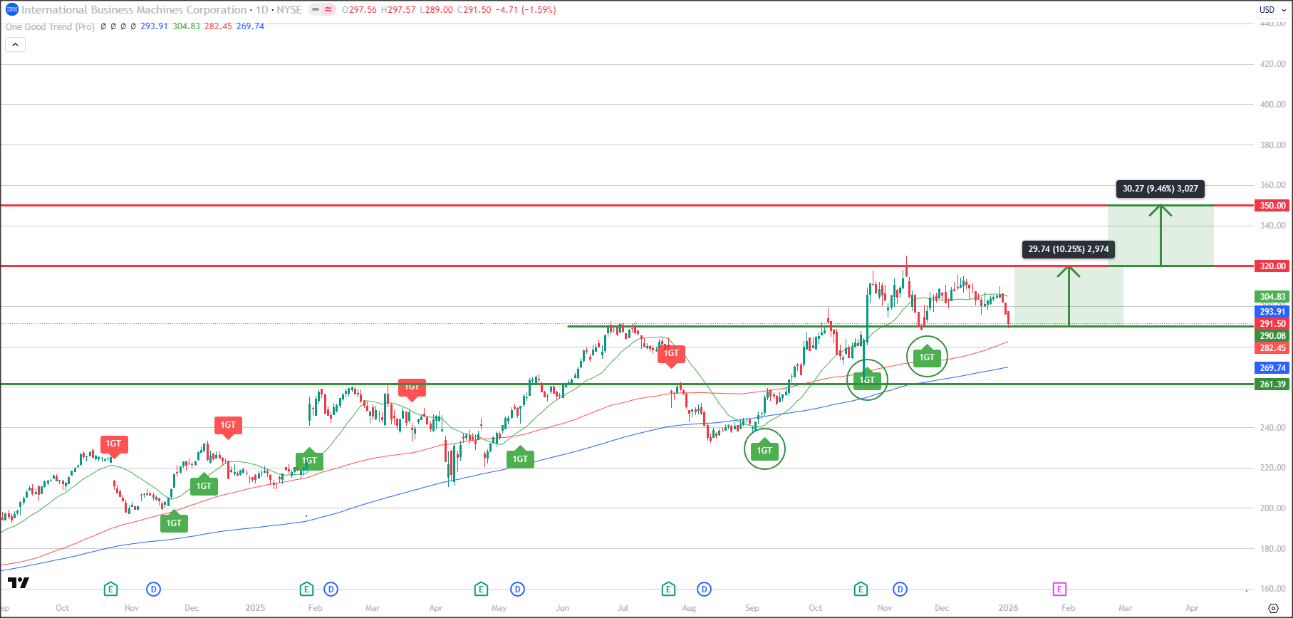 Any bullish price actions above the 320.00 level could see target raised to 350.00 first, signaling more upside for IBM.