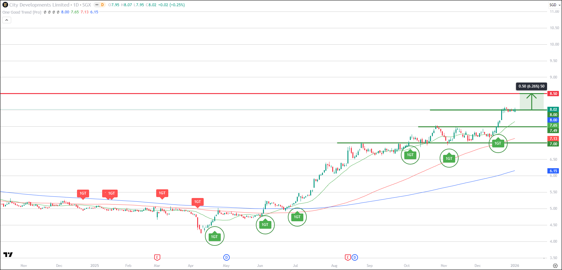 Latest 1GT bullish signal appeared as prices broke above the 7.50 resistance.
