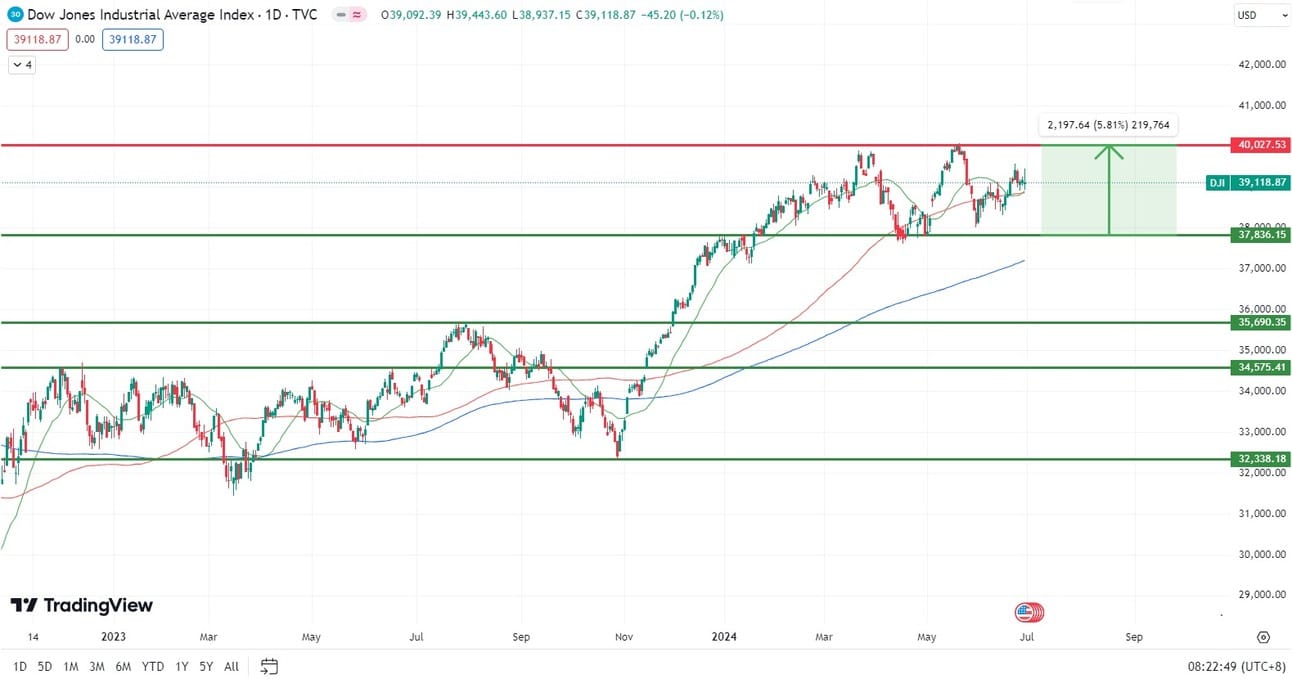 The index continues to trade within the bounds of 38,000 - 40,000 levels, with temporary resistance level around the 39,000- 39,200, attempting to hold above the 20d MA, and testing the temporary levels, upward momentum toward 40,000 level could be expected where sellers are likely to appear once more.
