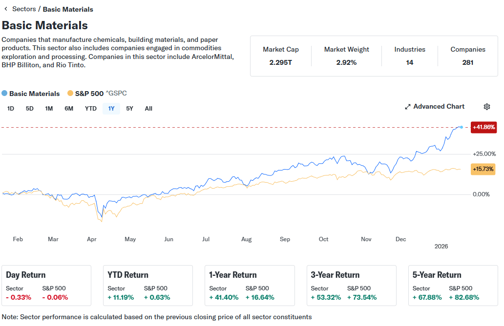 While tech stocks often dominate headlines, the basic materials sector has quietly been on a tear. Looking at the 1-year chart from Yahoo Finance, basic materials have returned +48.21%, easily outpacing the S&P 500’s +19.74%.