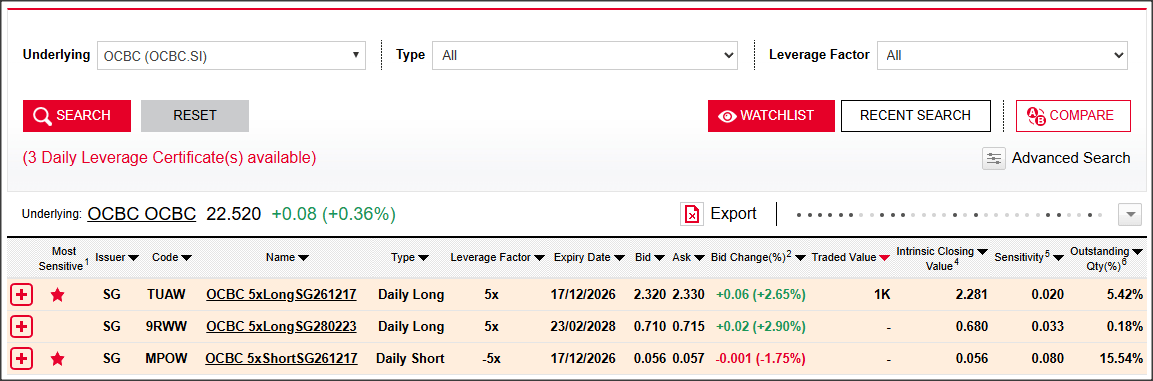Traders who are bullish can consider the OCBC 5xLongSG261217 (TUAW), while those who are bearish can consider the OCBC 5xShortSG261217 (MPOW) as shown below.