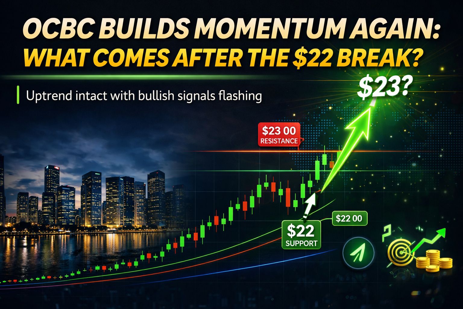 As Singapore’s banking sector continues to attract attention amid a resilient market environment, OCBC (O39.SI) is emerging as one of the steadier uptrend plays among the blue chips. The stock has maintained a well-structured climb over the past year, supported by strong price action and consistent higher lows. More recently, OCBC has pushed above the key $22.00 level, with a fresh 1GT Bullish signal appearing, signalling that buying momentum may be building again after a period of consolidation. This suggests that the trend is not only intact, but potentially preparing for its next leg higher.