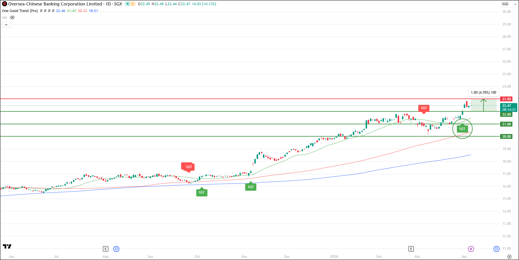 Overall, with the 1GT Bullish signal still active, moving averages aligned to the upside, and price pushing toward resistance, OCBC remains technically strong.