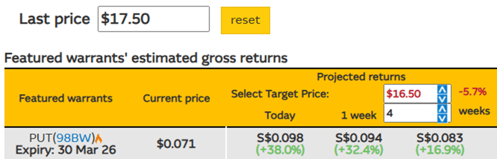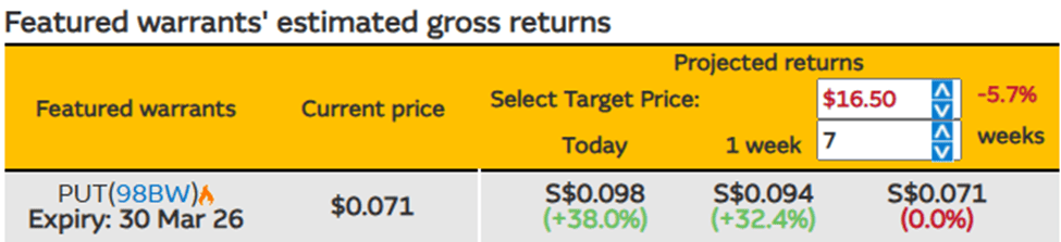 Put warrant 98BW will increase 16.9% from SGD 0.071 to SGD 0.083, three times more than SGX’s 5.7% share price fall.