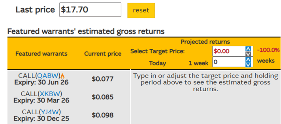 1) Enter under the “Last price” field the price at which you intend to take a bullish position on SGX shares, example: $17.70. The current prices of the warrants would in turn update to the bid price they would trade at should SGX trade there today: