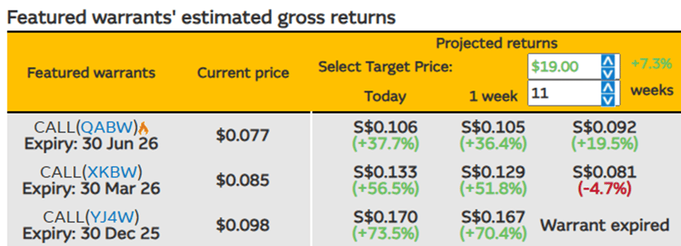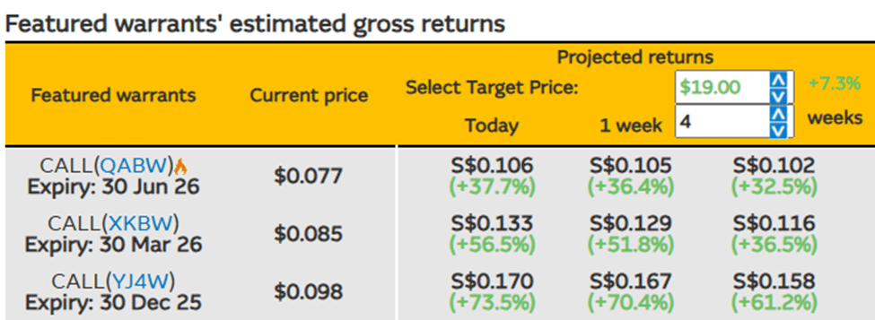 In this case, assuming all factors remain unchanged, If SGX took 4 weeks to increase 7.3% from $17.70 to $19.00, the first call warrant QABW (https://warrants.com.sg/tools/livematrix/QABW ) will gain around 4.5 times more – 32.5% from SGD 0.077 to SGD 0.102, while the second call warrant XKBW (https://warrants.com.sg/tools/livematrix/XKBW) will increase 5 times more i.e. +36.5% to SGD 0.116 and the last warrant YJ4W will increase more than 8 times that of SGX’s price change i.e. +61.2% to SGD 0.158.