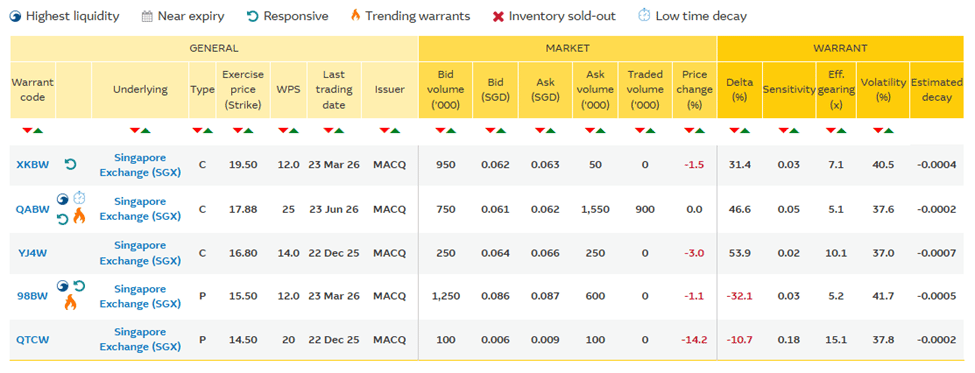 Investors who wish to be exposed to potential upside moves in SGX shares can consider using a SGX call warrant to magnify the share price return using lesser capital and without the risk of margin calls, while those bearish can use a put warrant. There are currently three call warrants tracking SGX shares listed in the market and two SGX put warrants.