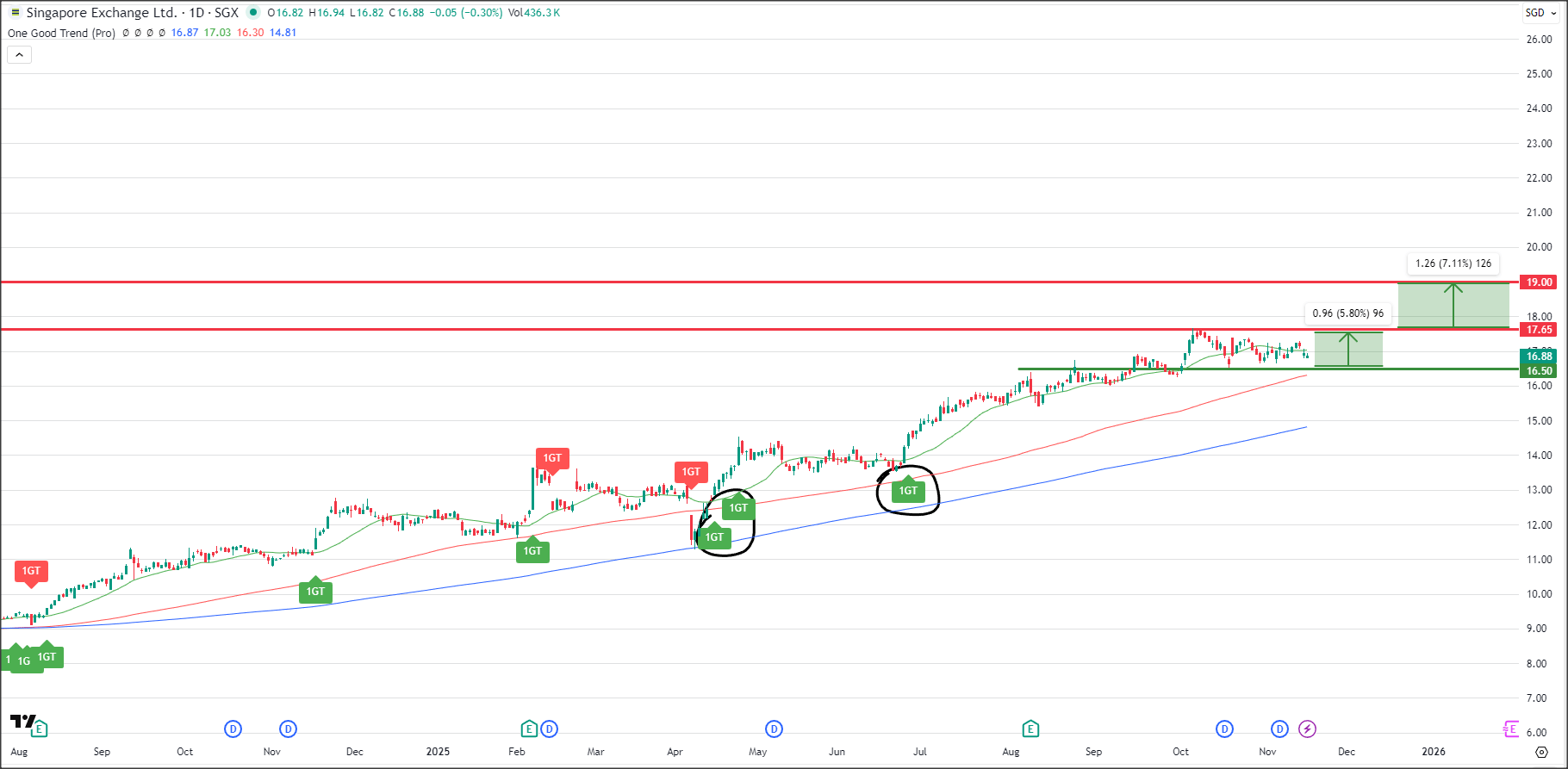 A conservative approach would be to accumulate near the $16.00 - S$16.50 entry zone, after prices have stabilized, and potentially a new 1GT Bullish Signal appears, where long-term support remains intact and downside is limited. A protective stop can be placed just below the $16.00 psychological support.